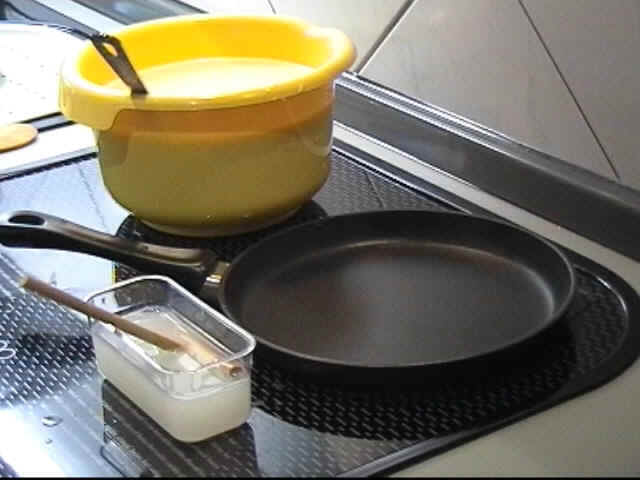 Stellen Sie einen dünnen Crêpesteig her. Verwenden Sie eine Teflonpfanne mit ca. 24 cm Ø (Bodendurchmesser ab 20 cm) und stellen Sie Ihr Zubehör wie auf dem Bild auf den Herd. Erhitzen Sie die Pfanne und reiben Sie sie mit einem öligen Tuch aus. (bitte nur ganz wenig Öl verwenden und nur am Anfang !)