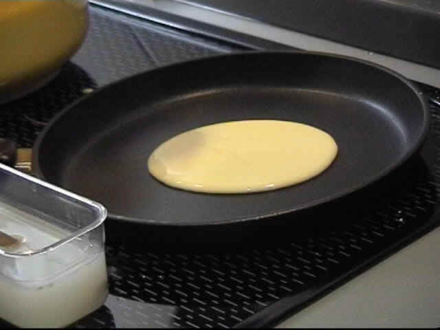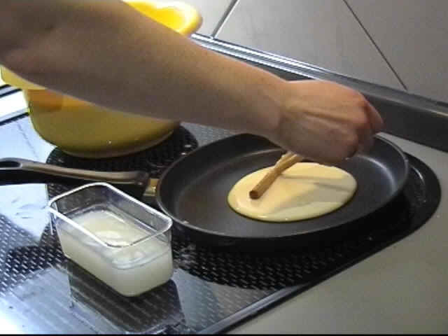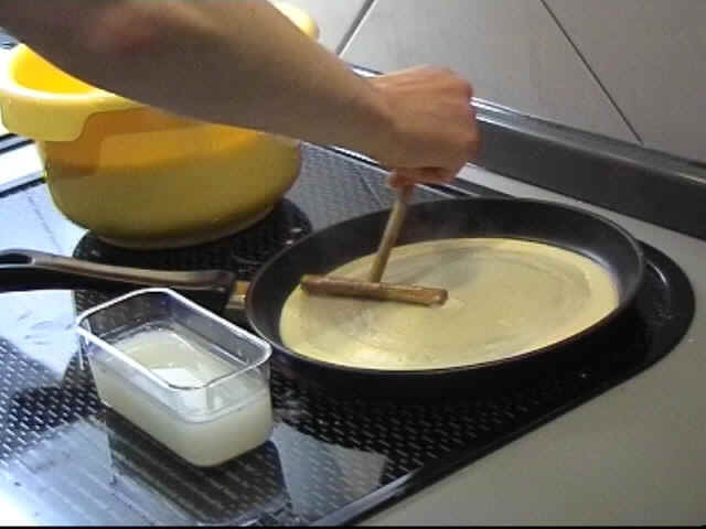 Geben Sie den Teig (ca. 35 ml entspricht einer Soßenkelle) möglichst in die Mitte der Pfanne, so läßt er sich leichter verteilen.