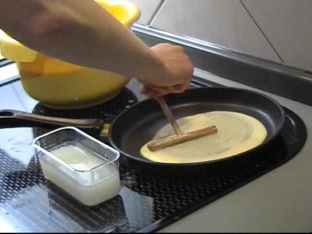 Nach jedem Crêpes sollten Sie die Reste von Teig und Belag aus der Pfanne mit einem Stück Küchenrolle auswischen, so bleibt sie immer sauber und erlaubt ein besseres Arbeiten.